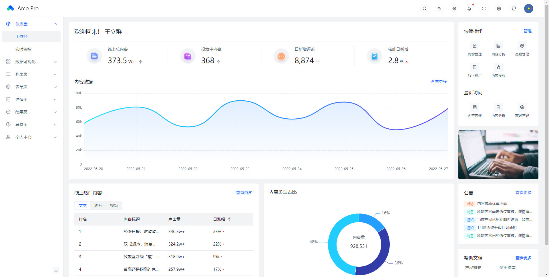 这个是字节跳动最近两年才开源出来的视觉设计和生态框架,和 semi 同属一家公司还几乎同时开源 😂, 居然还同时被指抄袭 antd, 它有 React 和 Vue 两个版本,官方提供 arco-pro 基础开发框架