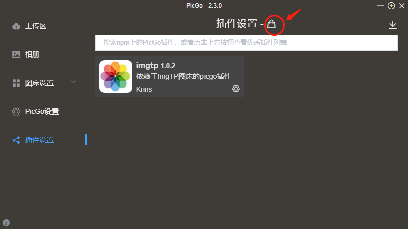 点击插件设置可以进行关键字搜索进行安装,有时候不知道有哪些插件可用,所以我更喜欢点上面的购物袋进行插件列表查看,或者点这里直接传送;然后看看哪些图床可以使用。